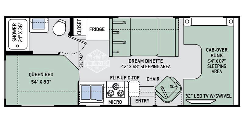 Sleeps up to 6 – rear queen bed, cab-over bunk, and convertible dinette